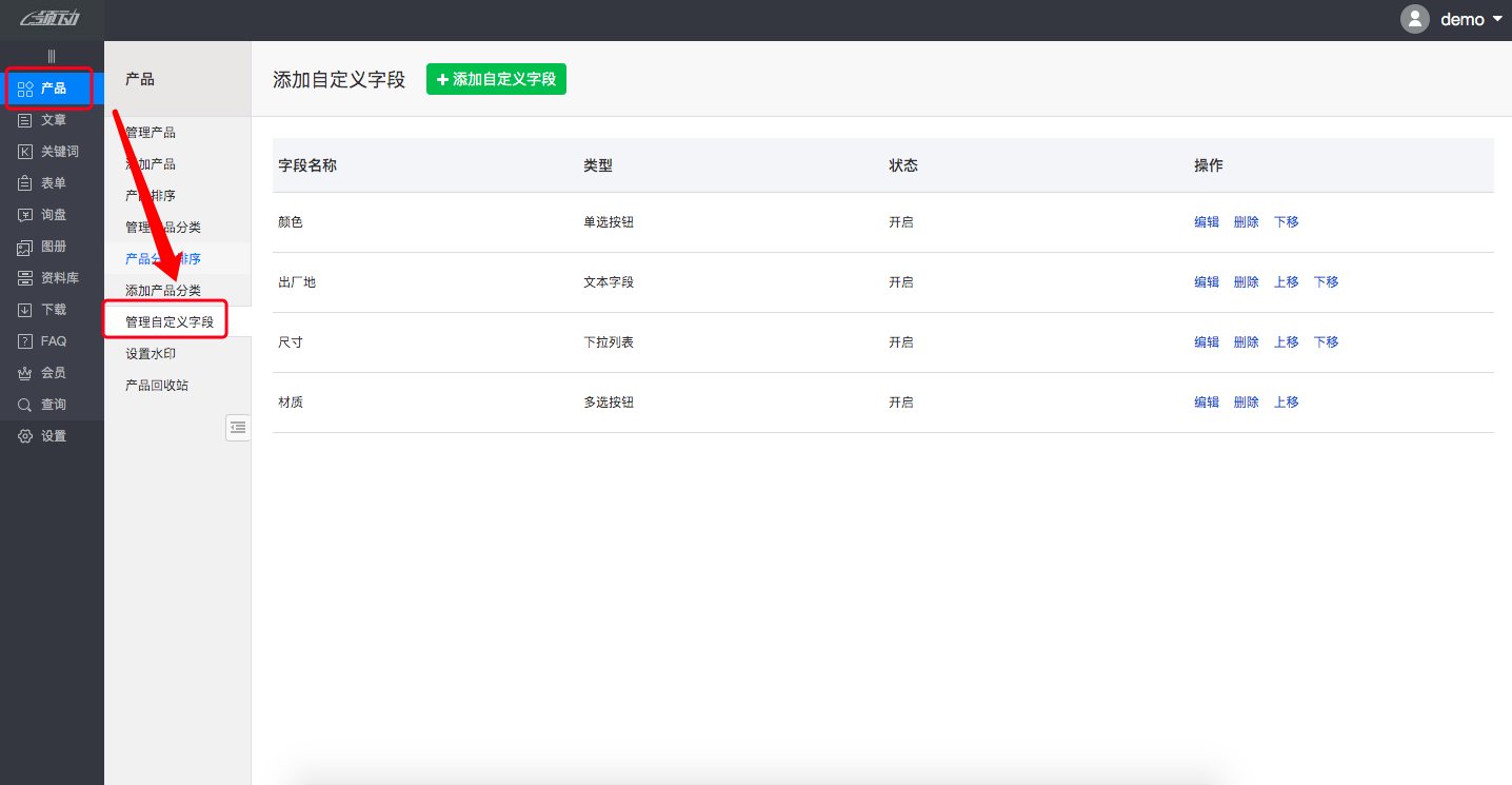 【操作指导】进入“内容管理”后台,在“产品”—“管理自定义字段”页面,设置产品自定义字段,可针对自定义字段进行添加、编辑、删除、移动等操作,如下图所示: