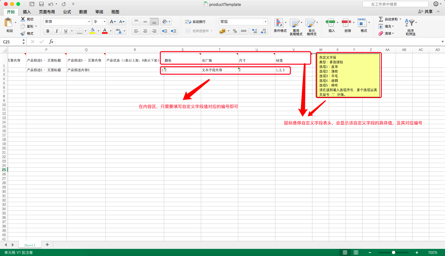 打开Excel模版,鼠标悬停在“自定义字段”表头,可以看到自定义字段的具体值及其对应编号,只需在下方表格中填写对应的编号即可,如下图所示: