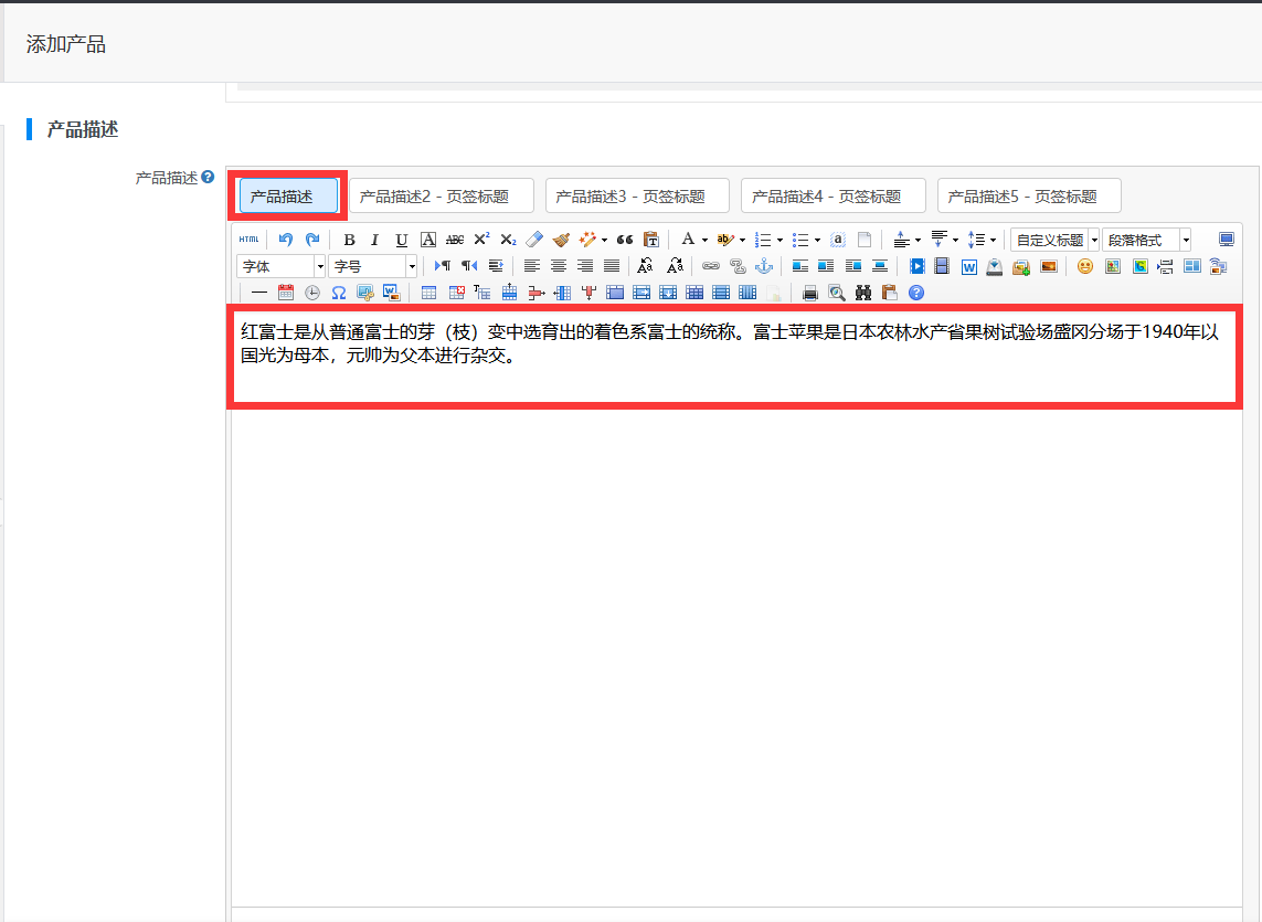 6).产品描述1-页签标题、产品描述1-页签内容即该产品描述第一组页签标题名称以及第一组页签中的描述内容,