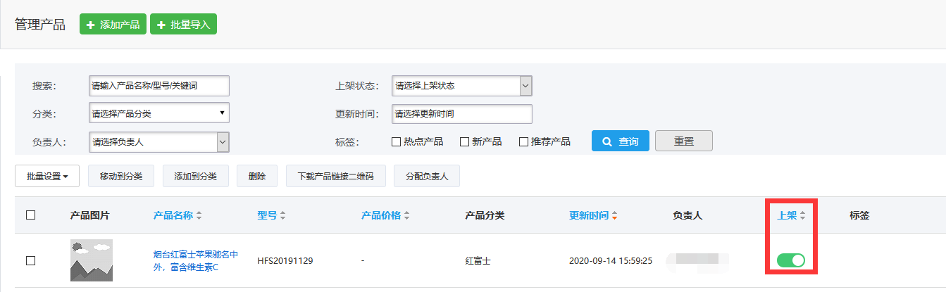 自定义字段设置完成后,进入“管理产品”页面,点击“批量导入”按钮,如下图所示: