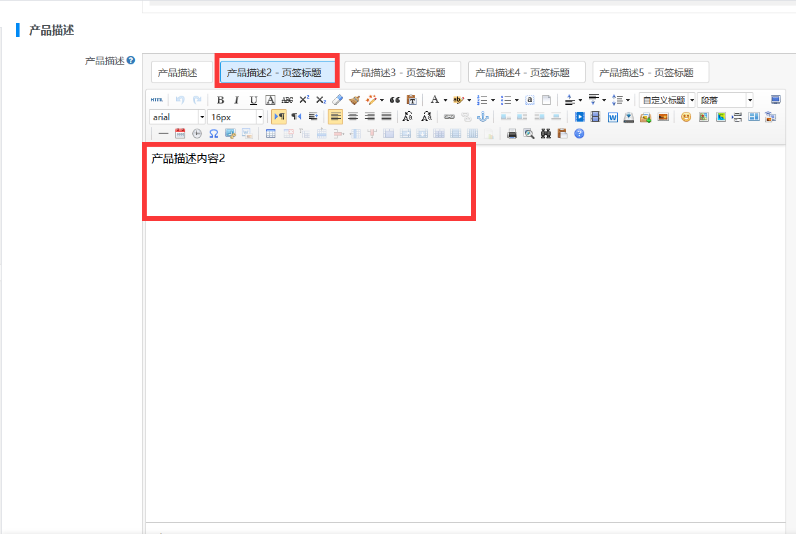 产品描述2-页签标题、产品描述2-页签内容即该产品描述第二组页签标题名称以及第二组页签中的描述内容,