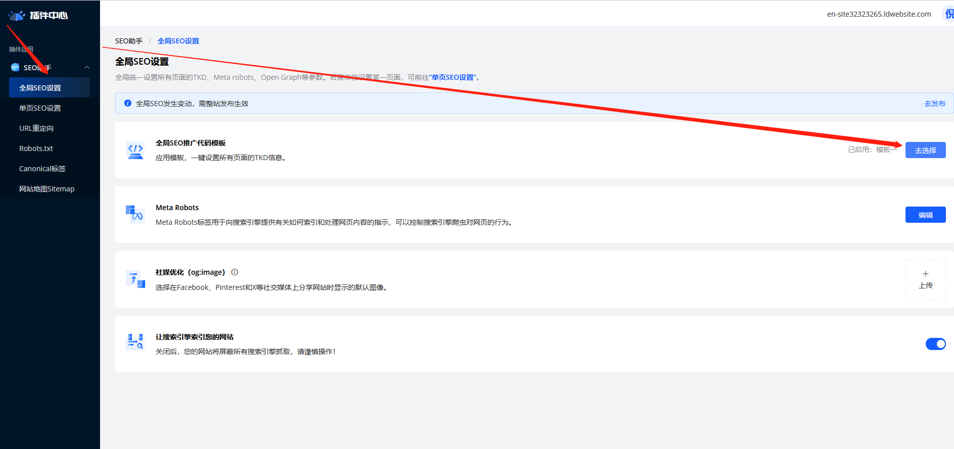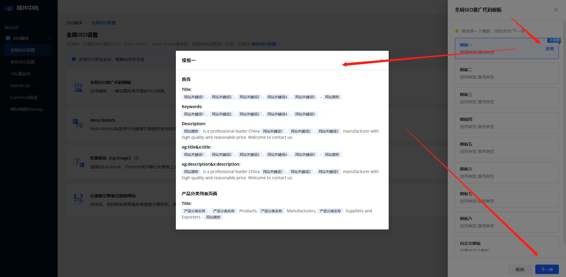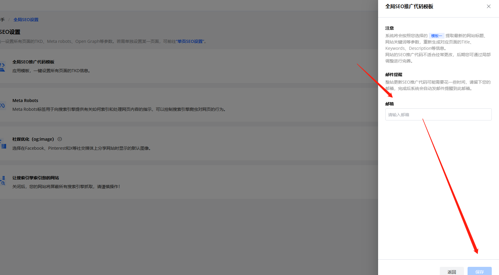 2、点击左侧侧边栏中的我的插件-SEO插件-全局SEO管理-选择适用的全局SEO推广代码模板,填写重置完成后的通知接收邮箱,点击保存;