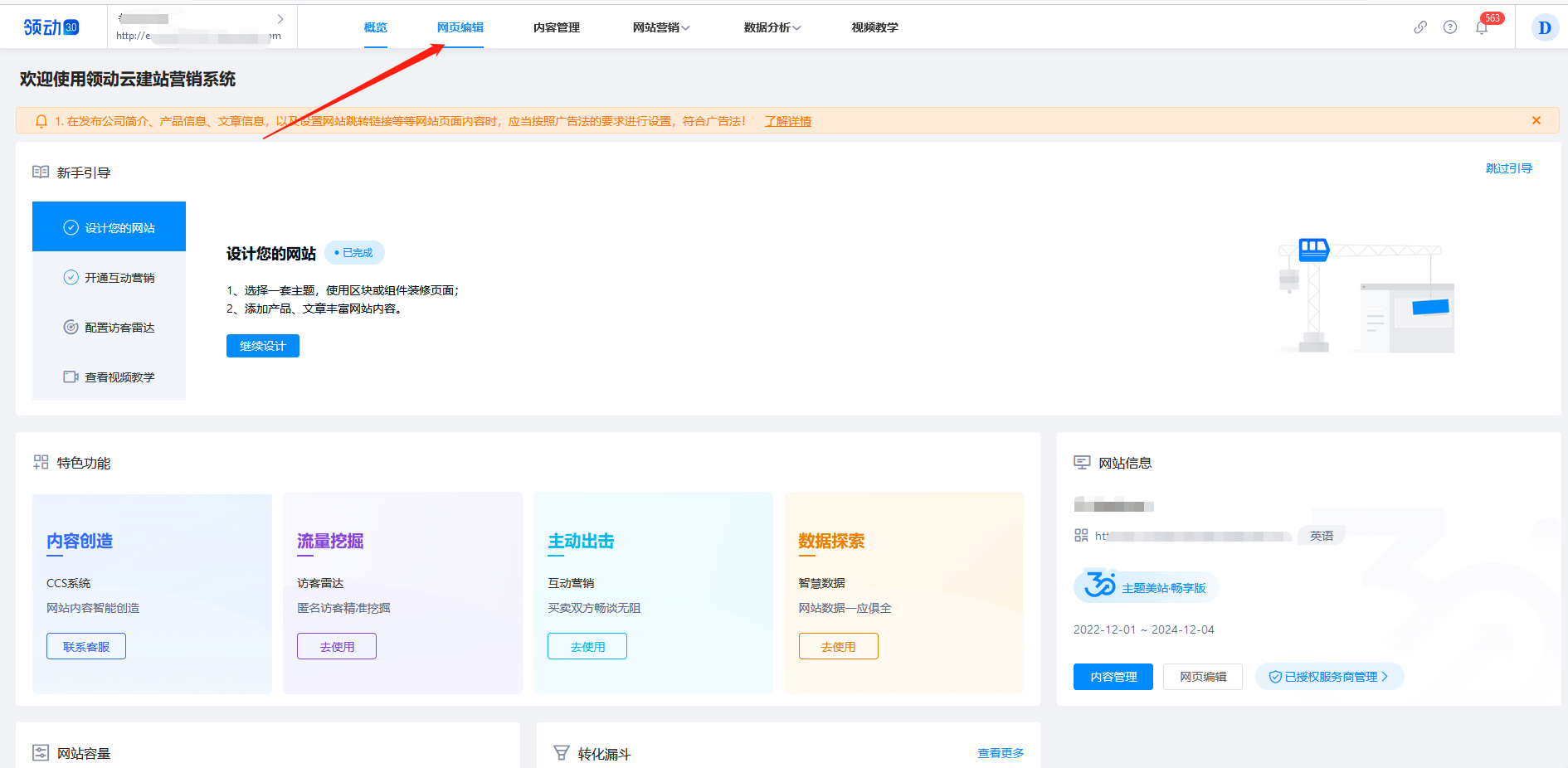 1、登陆领动官网-进入编辑网站后台