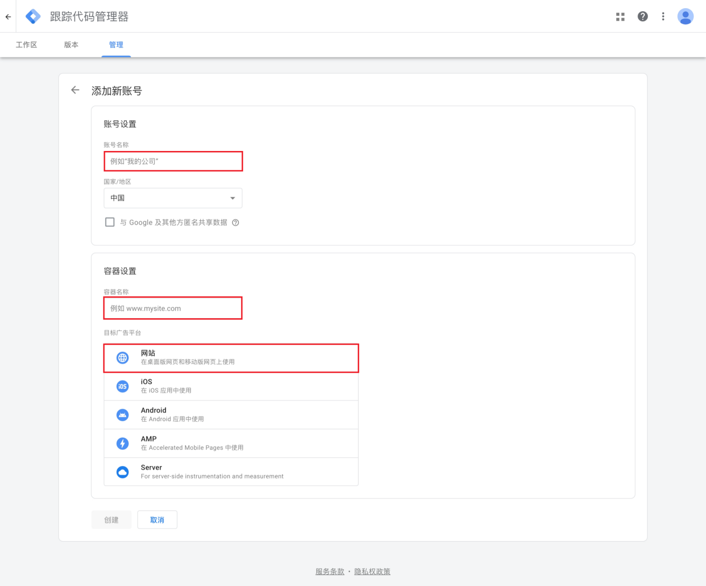 (2)容器名称:建议填网站域名URL,方便后续管理识别;