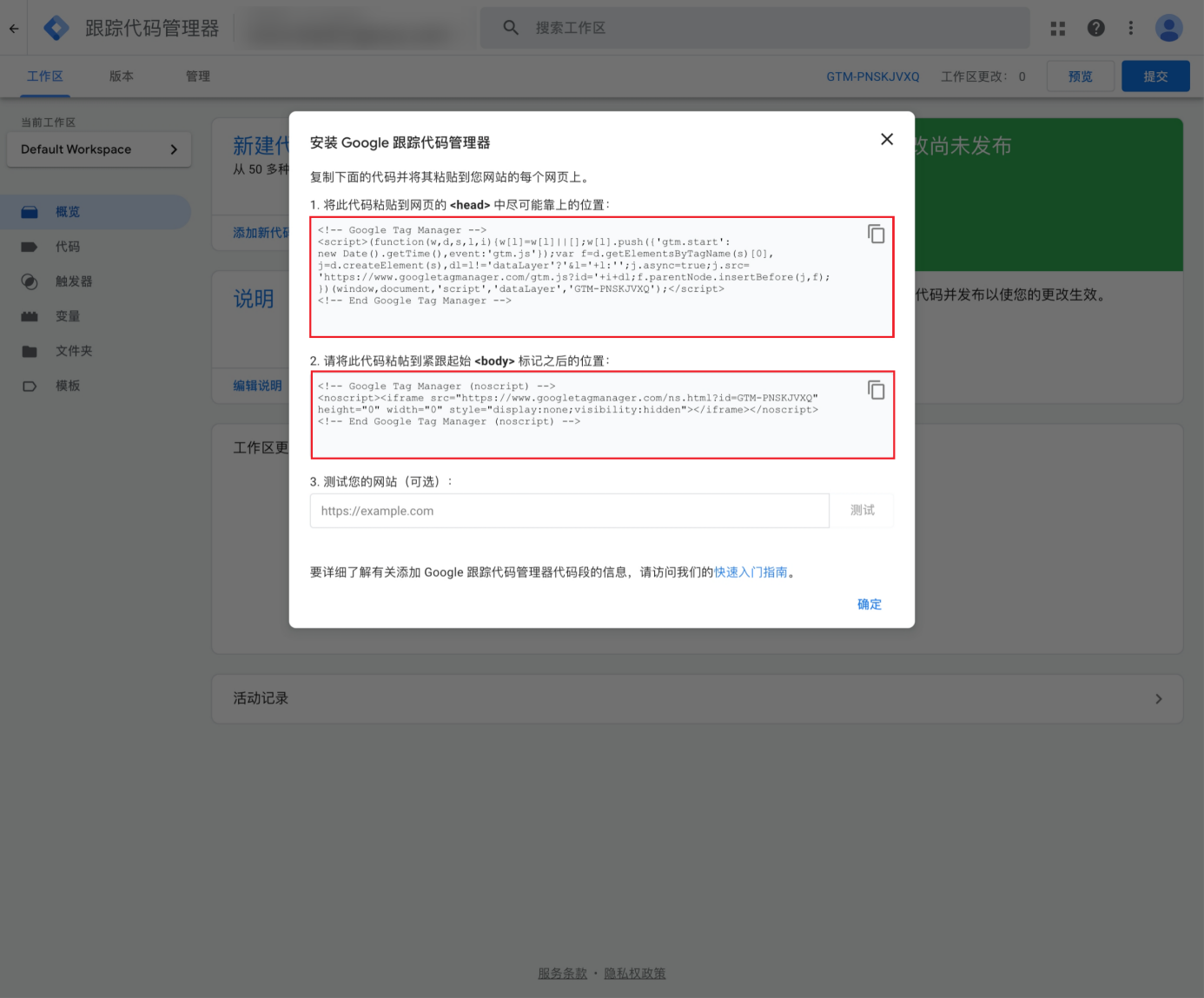 注意:建议在此步骤中,参考【步骤4】图示中的代码格式,检查网站中是否已经部署过TagManager代码,以避免重复部署;