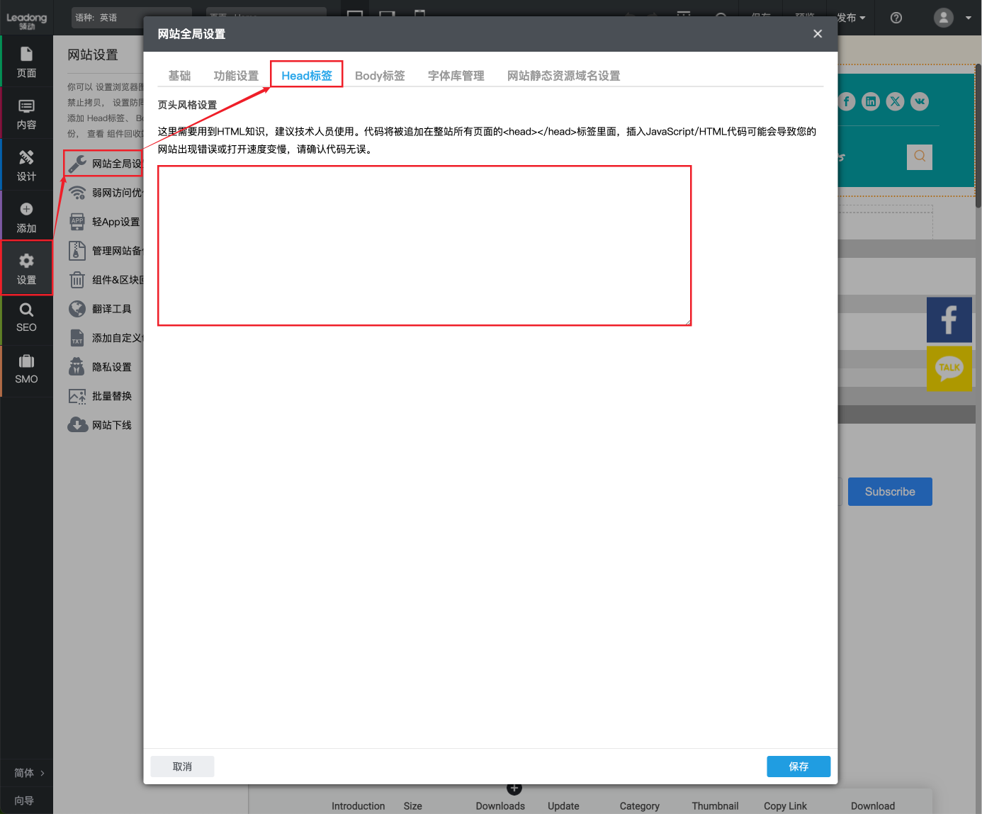(1)在网站编辑器 - 侧边栏 - 设置 - 网站全局设置 - Head标签中,嵌入【步骤4】图示中第一段代码;