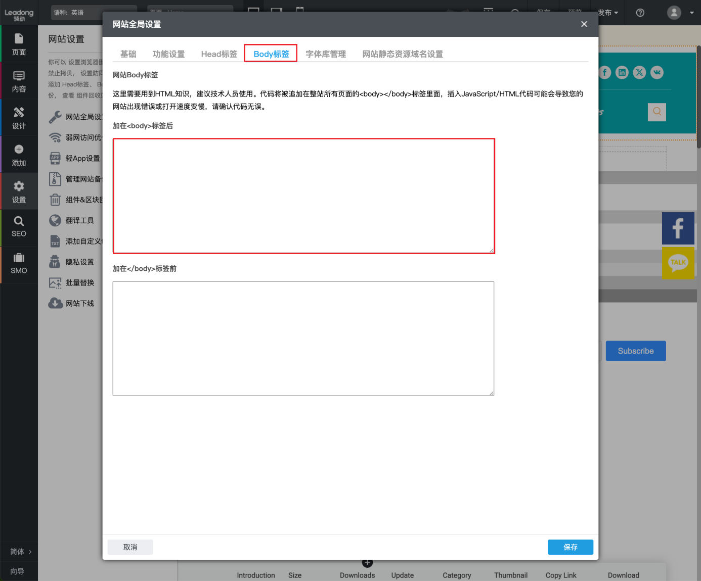 (2)在网站编辑器 - 侧边栏 - 设置 - 网站全局设置 - Body标签中,嵌入【步骤4】图示中第二段代码;