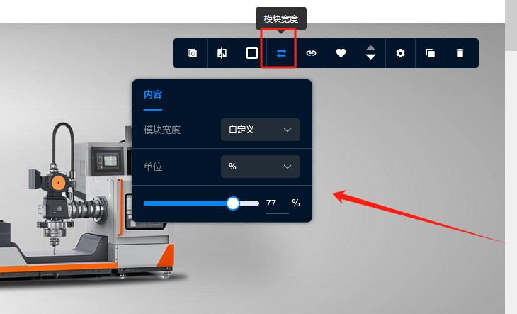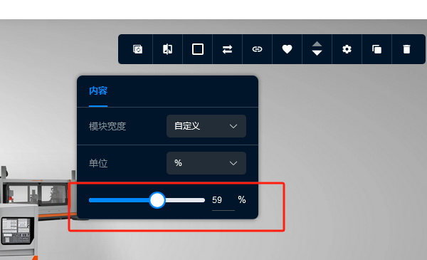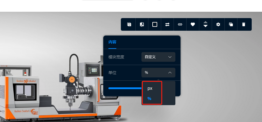模块宽度可以选择系统提供的数值,也可以自定义模块宽度,模块宽度的单位分为PX和%,我们可以自定义根据各自需求选择单位,然后通过拖动下面的滚动条来进行调整,如图所示: