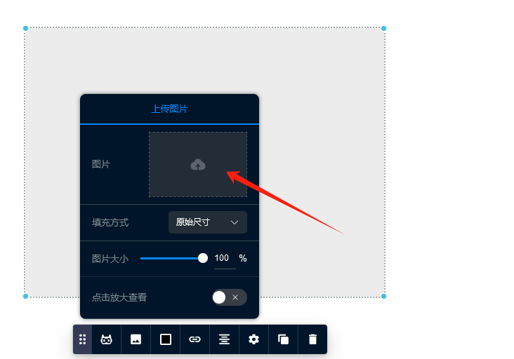 点击图片设置,我们可以看到图片上传的入口,并且还可以在图片设置大小、填充方式,如图所示: