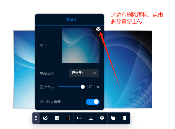 如果想要替换图片,可点击图片设置里的删除的图标,然后重新上传,如图所示: