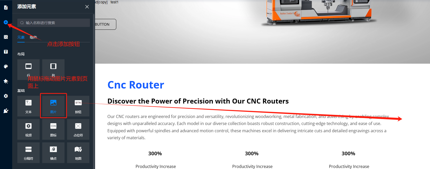 首先我们需要先添加图片元素,将图片元素拖动到需要放置的位置,如下图所示: