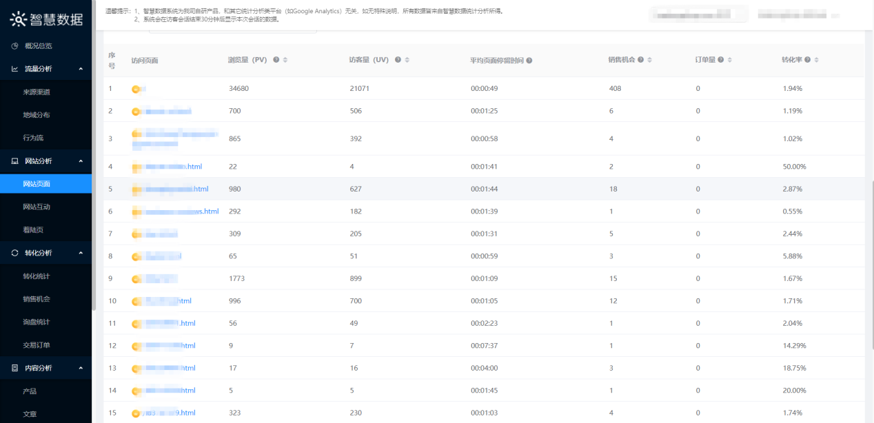 你还可针对访客、流量来源、站点页面、转化(询盘/订单)等多维度数据进行采集和分析。