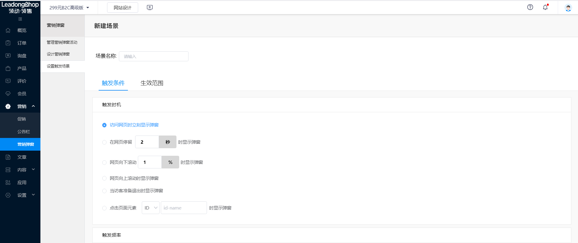 领动领售研究院提示:在Leadongshop网站设计页面,你可以在营销弹窗出设置在访客退出时显示弹窗,在客户要关闭网页是,推送活动折扣等吸引顾客再次返回界面。