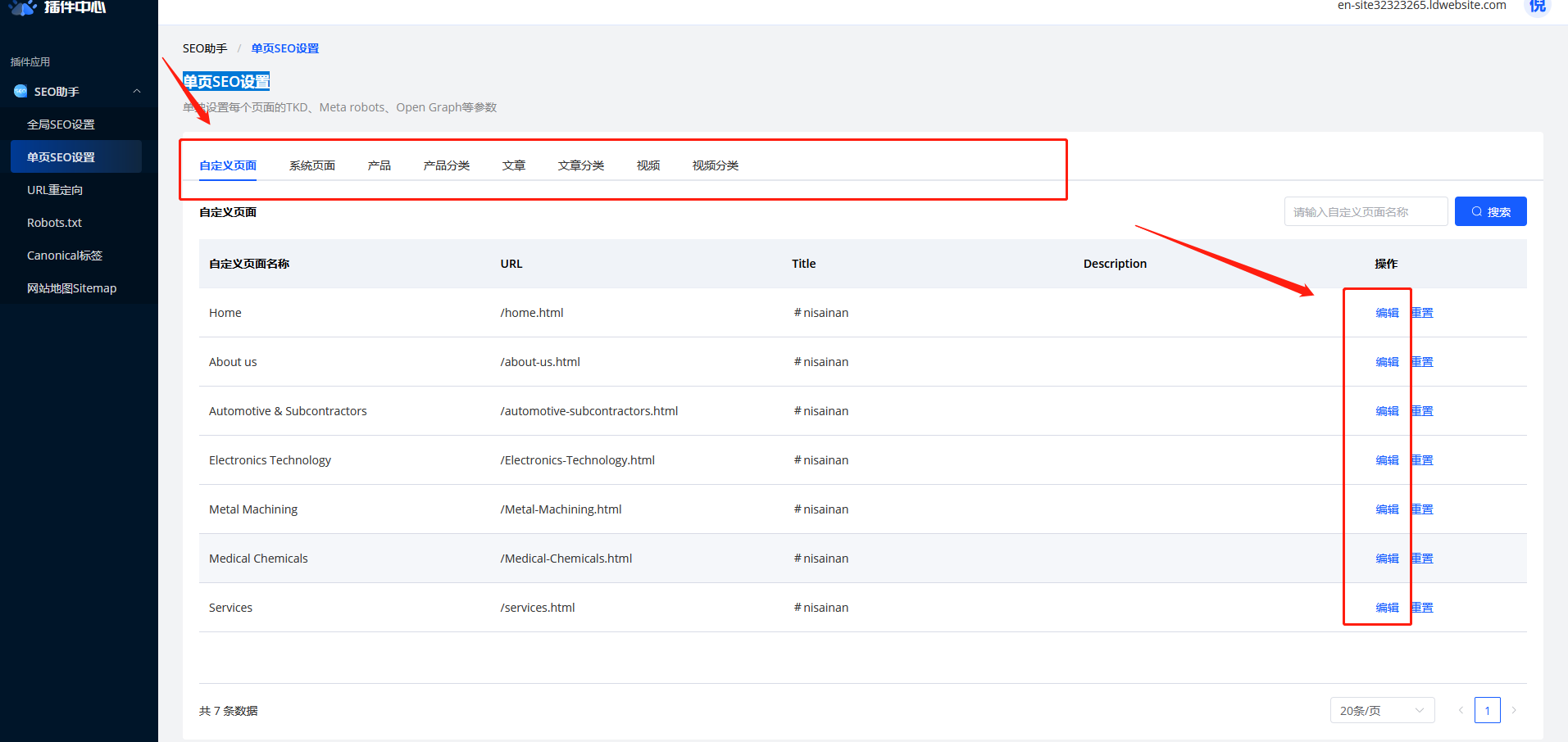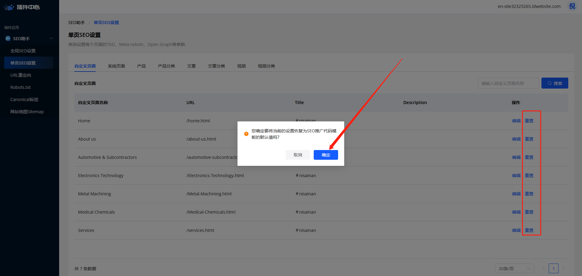 3、选择对应页面-点击编辑按钮,可对该页面的关键词、tkd等SEO设置进行编辑,也可以点击重置按钮,直接根据全局SEO推广代码自动生成;