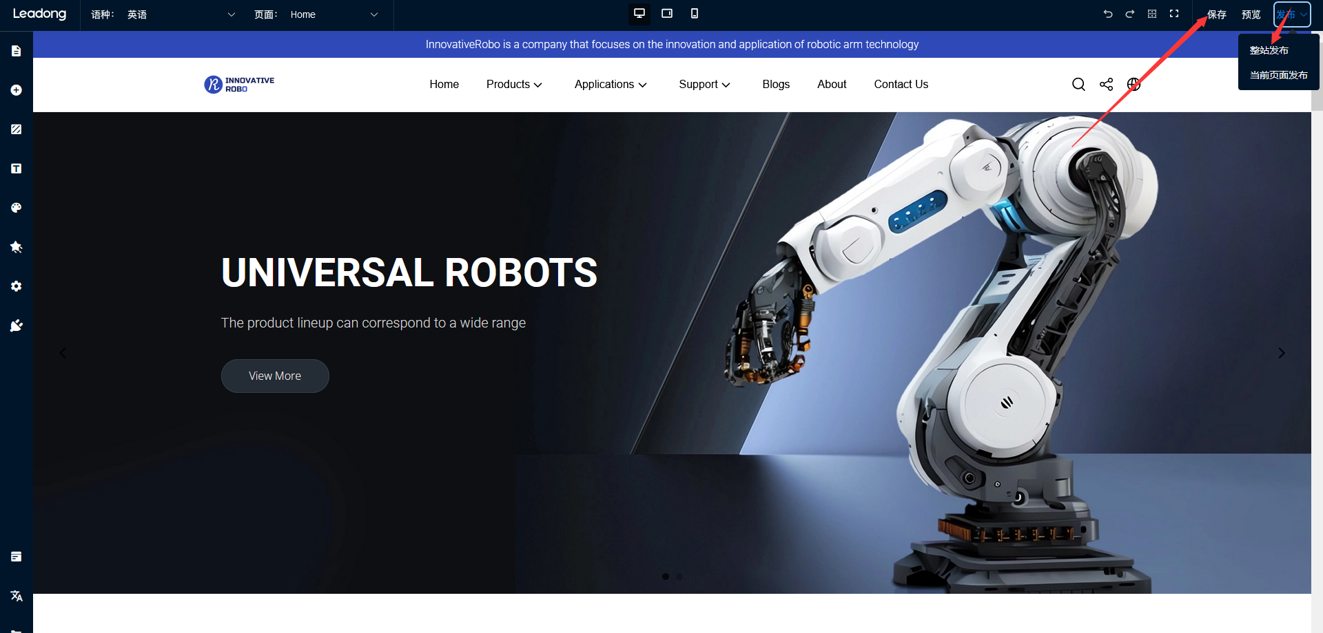 4、回到网站编辑页面,点击页面右上角的保存-整站发布,发布后,前台预计15分钟左右生效;