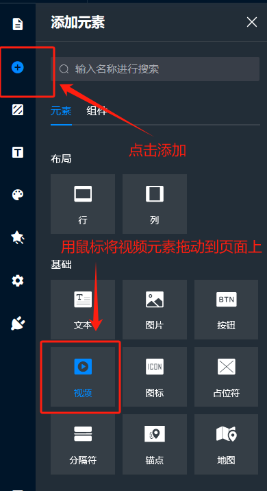 首先我们需要先添加视频元素,将视频元素拖动到需要放置的位置。如图所示: