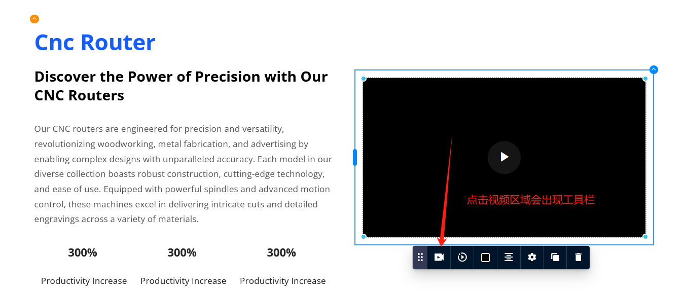 点击视频区域,会出现工具栏,里面有视频设置,如图所示: