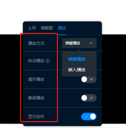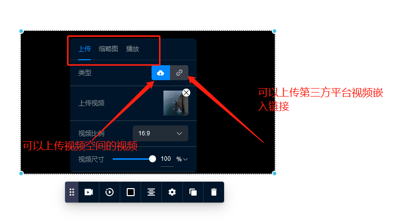 进入视频设置里,可以上传视频,还可以针对视频比例,视频尺寸做设置,同时还可以上传视频缩略图,如图所示: