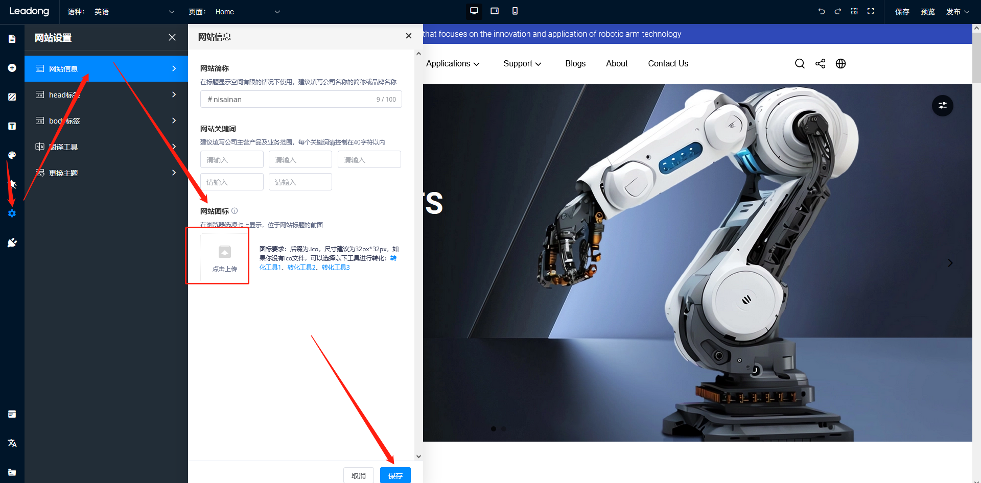 2、点击左侧侧边栏中的网站设置-网站信息-网站图标,需要先制作一个后缀为.ico,尺寸为32px*32px的文件,单击下图中所示的“转化工具”按钮可在线制作此图标,图标制作后上传-保存;