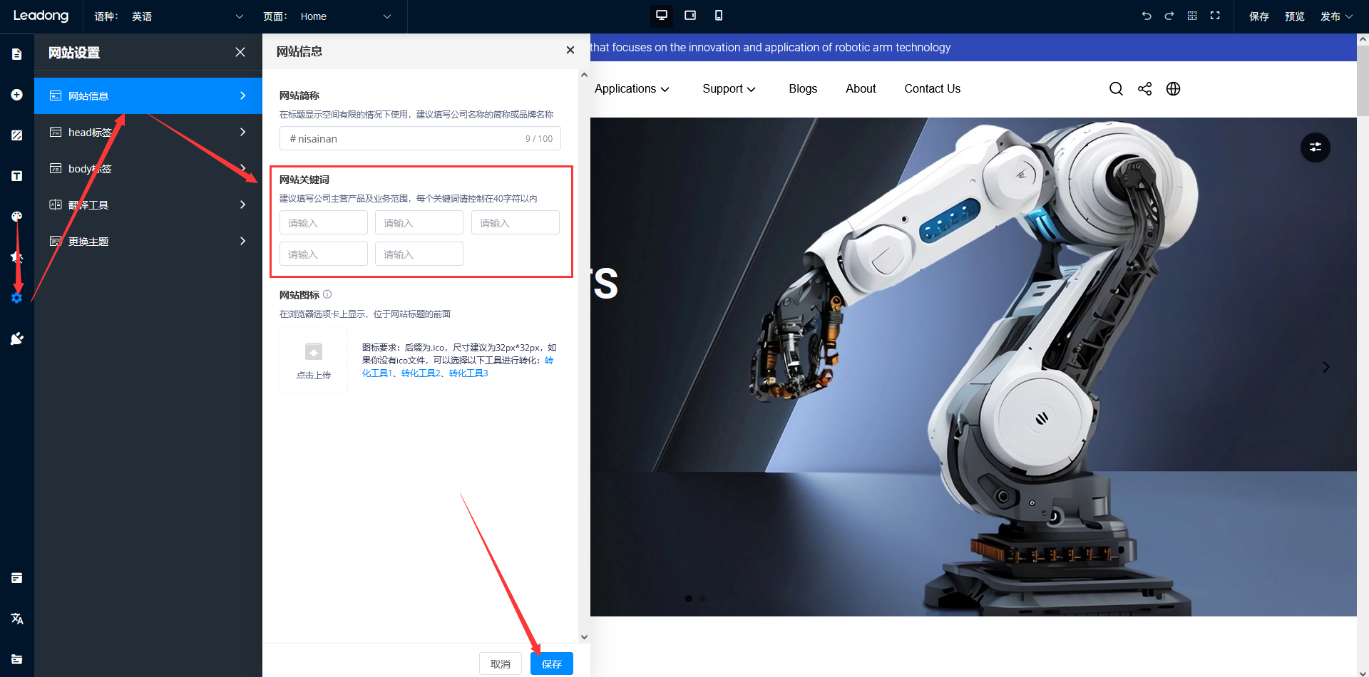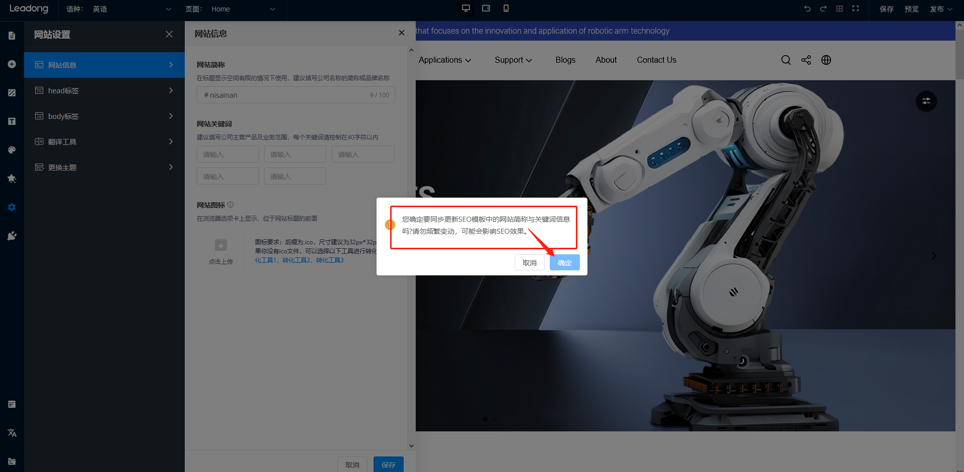2、 点击左侧侧边栏中的网站设置-网站信息-网站关键词-保存,如果网站已经积累了一定的收录,请慎重操作,可能会影响SEO效果,确认没有问题点击确定;